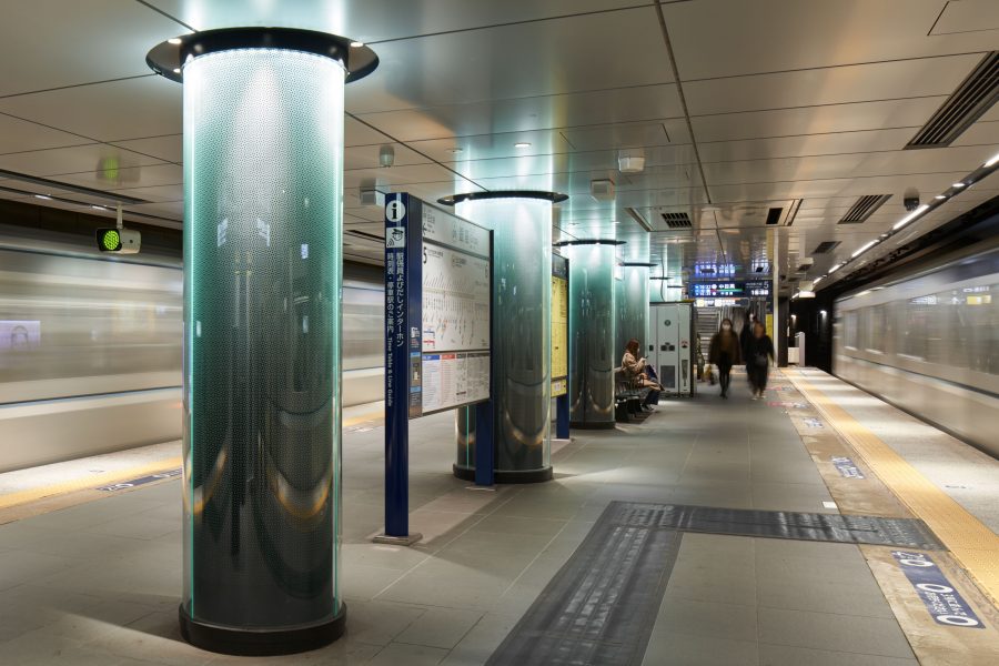上家からホーム階まで光を繋げ、一つの駅としての統一感を作り、居心地の良い光で包まれる空間を創出した。直感的に分かる形状と方向性を3路線に設け光と色、地上の景色を地下空間に持ち込むことで分かりやすい駅空間を目指した。